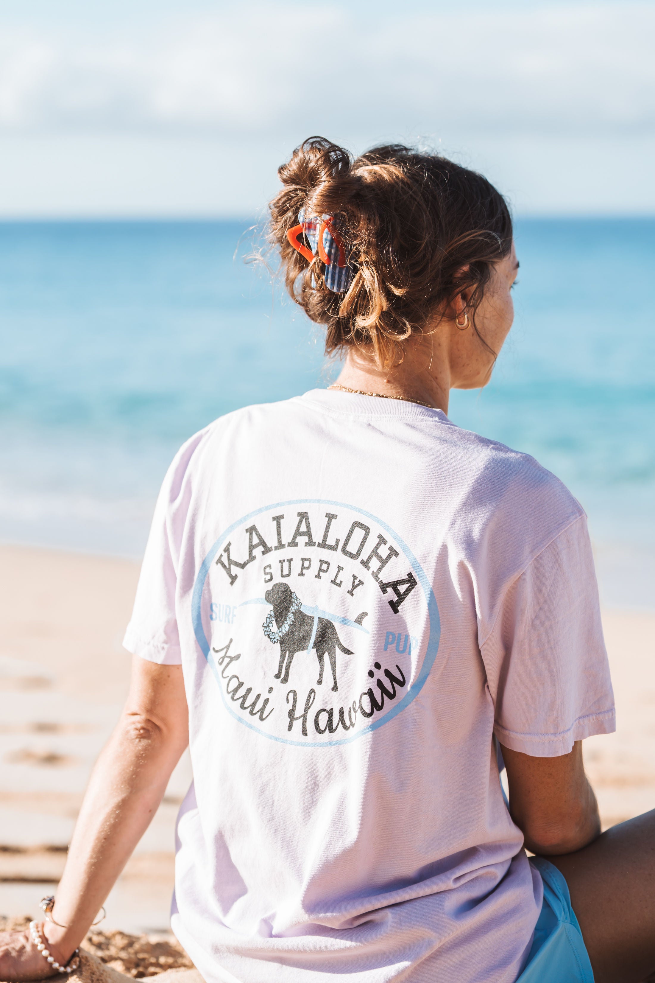 Meet your new favorite tee! The Board Caddie T-Shirt features Poppy, our lovable surf pup mascot, striking a pose with surfboard on her back and a lei around her neck. Available in espresso and orchid, this playful design captures the laid-back spirit of island life. Perfect for beach days, casual hangouts, or anyone who loves a good laugh—and surfing dogs.